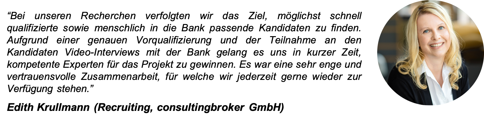 - Organisation sämtlicher Interviews sowie Kommunikation unseres Feedbacks an die Kandidaten durch consultingbroker/Wachsmann, somit weitgehende Auslagerung dieser Aufwände und Entlastung der Bank