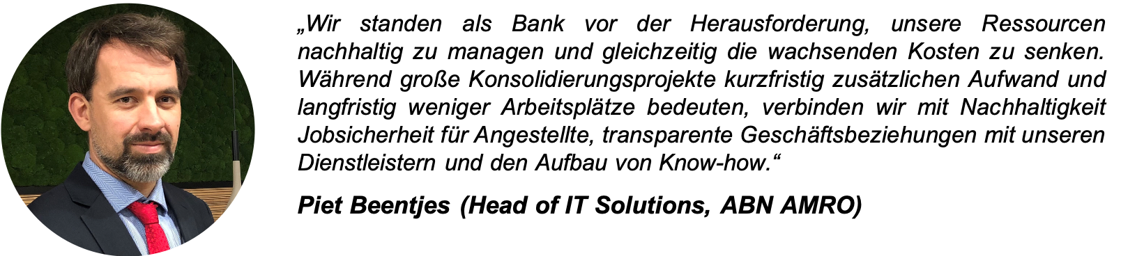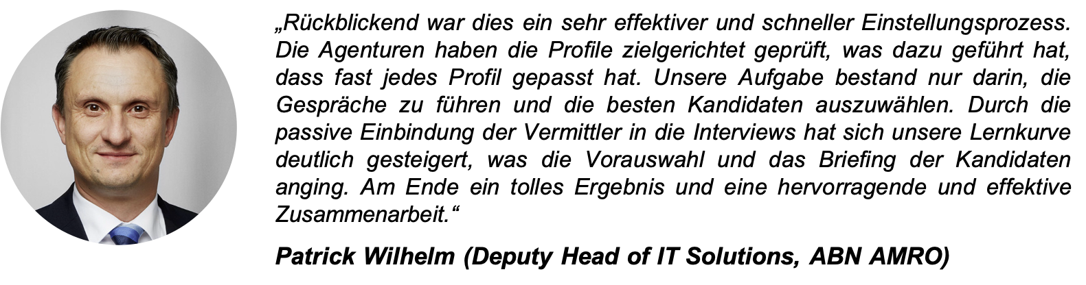 Die besondere Herausforderung: Die Hälfte der Neuanstellungen sollte für zwei Jahre befristet sein. Gleichzeitig galt es, den Wissenstransfer der bisherigen externen Mitarbeiter sicherzustellen, um die gewohnte Servicequalität für das Business beizubehalten. Über die Machbarkeit befristeter Anstellungen bestand bei sowohl bei den Vermittlern, als auch bei ABN AMRO selbst große Unsicherheit. Ein spannendes Projekt.