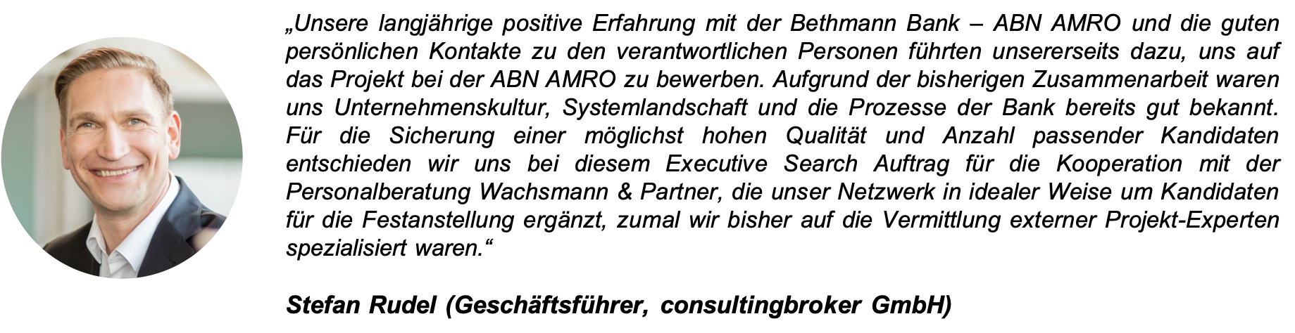 Genau für diese anspruchsvolle Aufgabe beauftragte uns die ABN AMRO, mit dem Wissen, dass die consultingbroker GmbH bisher wenig Erfahrung im Bereich Executive Search hatte. Für uns war dieses erste Projekt im Bereich Executive Search besonders spannend, da sich die Art der Mitarbeitersuche deutlich von der Vermittlung freiberuflicher Experten unterscheidet. Doch durch unsere langjährige Recruiting Erfahrung und in Kooperation mit der Agentur Wachsmann & Partner konnten wir in kurzer Zeit die ausstehenden Positionen bei der Bethmann Bank in Frankfurt mit passenden Kandidaten innerhalb von 3 Monaten besetzen.