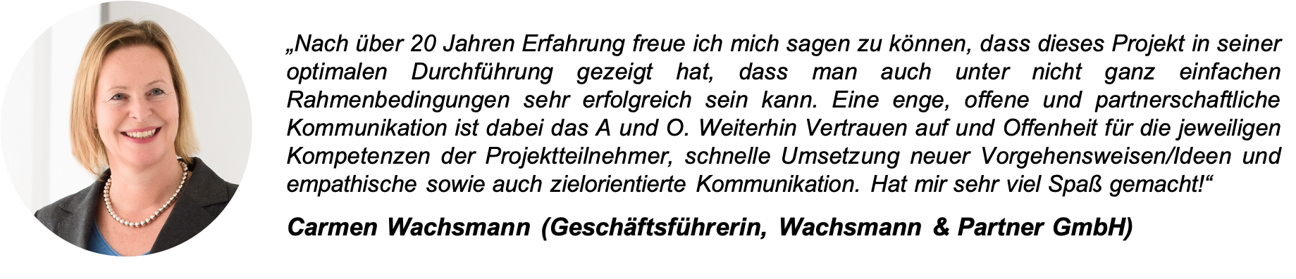 - Neben einer internen Versetzung wurden 2 frühere Externe in eine Festanstellung übernommen und 8 neue Mitarbeiter durch die Vermittlung von consultingbroker/Wachsmann hinzugewonnen, davon 1 außerhalb von IT Solutions.